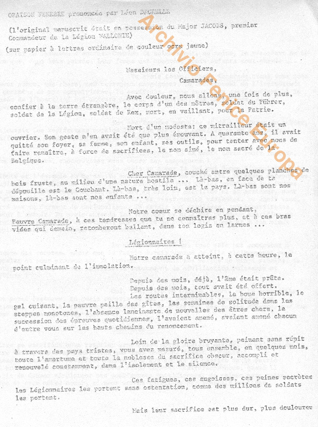 Discorso pronunciato dal Generale Leon Degrelle a Cherbinowaka il 17/12/41. Tre pagine.