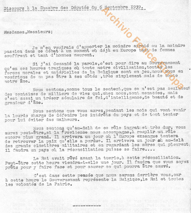 Discorsi al parlamento belga di Leon Degrelle del 27 Aprile 1939 e del 06 Settembre 1939. Sette pagine.