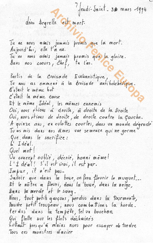 Un veterano della Vallonie ricorda Leon Degrelle nel giorno della sua morte. Cinque pagine.