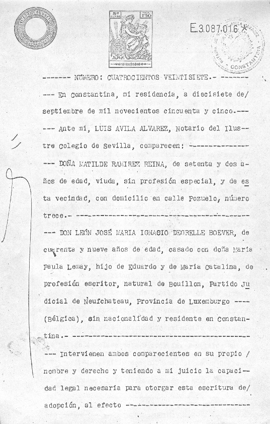 17 settembre 1955, atto di adozione di Leon Degrelle da parte di Donna Matilde Ramirez Reina. Tredici pagine.
