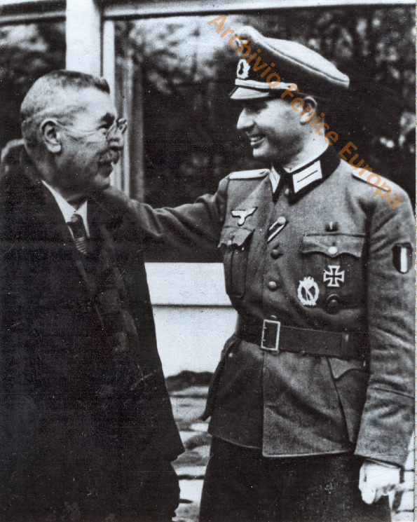 Leon Degrelle con una persona anziana. L'atmosfera è d'affetto. Probabimente un parente stretto. Una pagina