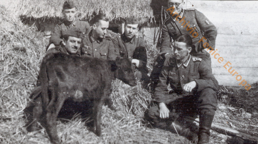 Gruppo di militi con un vitellino, dagli sguardi s'intuisce che non finirà in pentola. Fronte dell'Est, data e luogo non noti. Una pagina