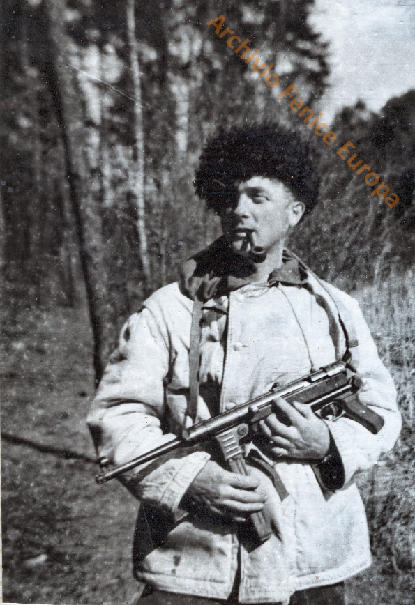 Foto di un milite forse un fratello della foresta. Mitra tedesco MP 40, giaccone invernale tipo Whermacht, colbacco di pelo usato  da caucasici, cosacchi o baltici. Due pagine