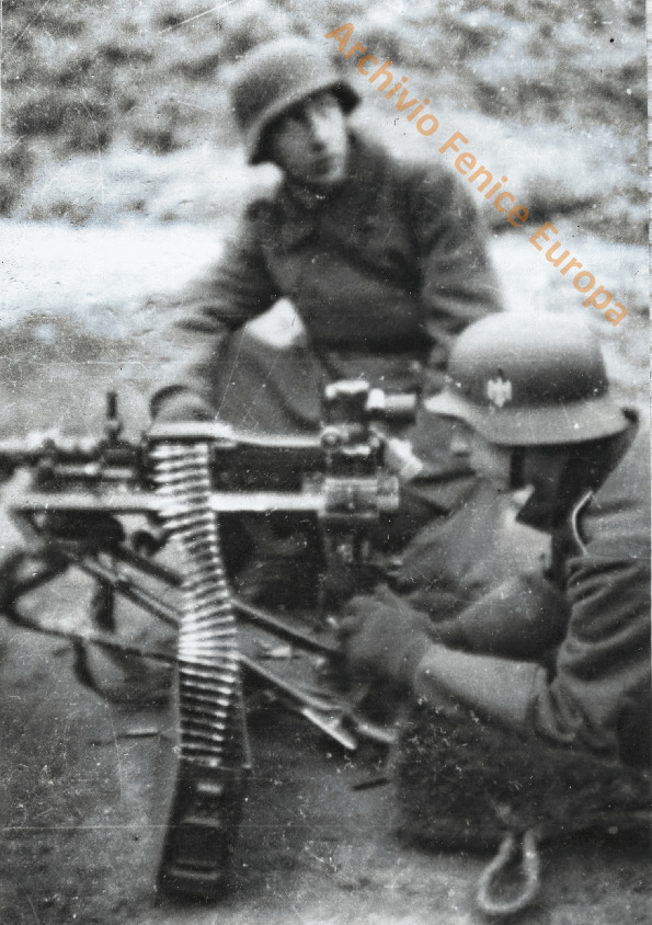 Fronte dell'Est, due mitraglieri in posizione. Mg 34 su treppiede, erano necessari due uomini. Elmo con aquila Whermacht o Kriegsmarine, cambiava solo colore, se argentata esercito ,se dorata marina. Dall'immagine in bianco e nero non si può dedurre con certezza, valutando lo sfondo probabile Whermacht . Documento composto da una pagina.