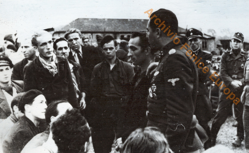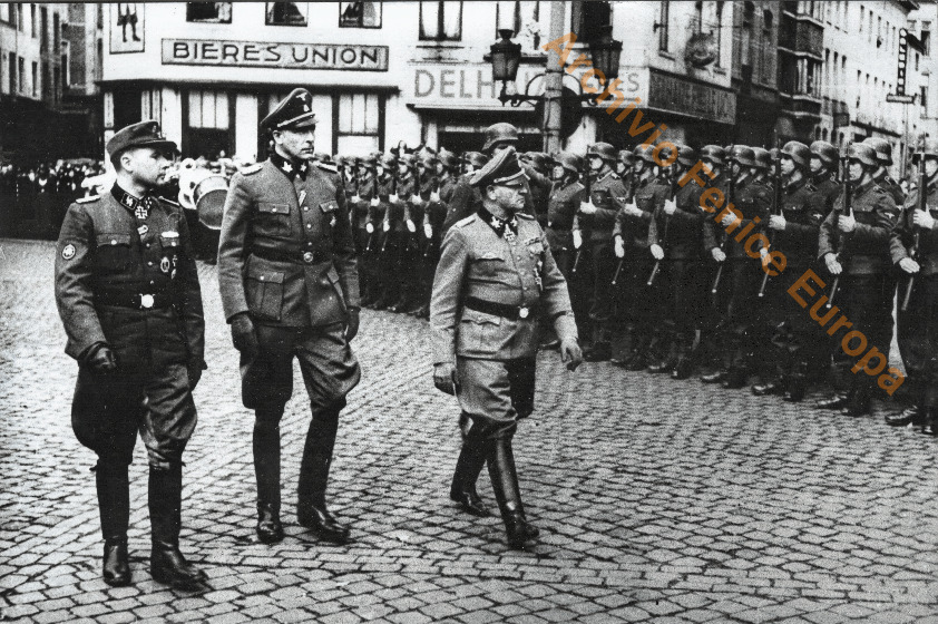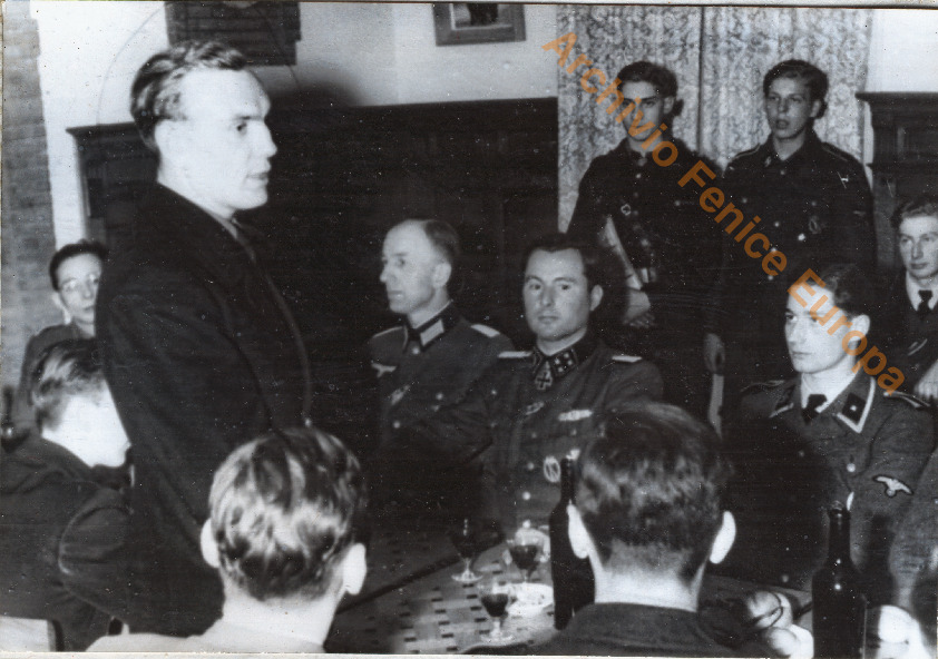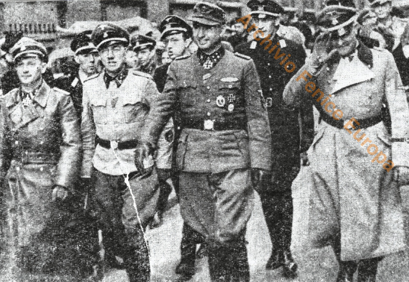 Il Generale Leon Degrelle sorridente insieme ad ufficali tedeschi e militi. Una pagina.