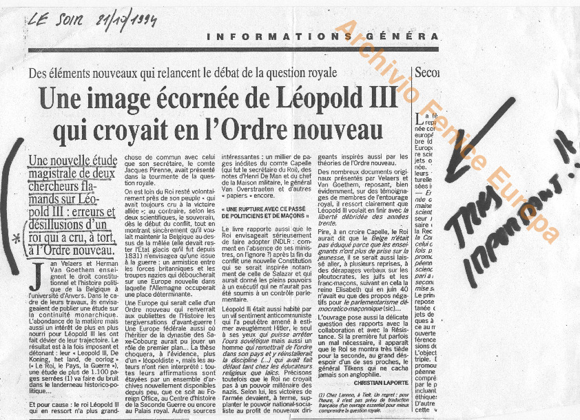 Articolo de le Soir del 21/10/94  sulla monarchia belga, annotazione di Leon Degrelle "molto importante". Una pagina.