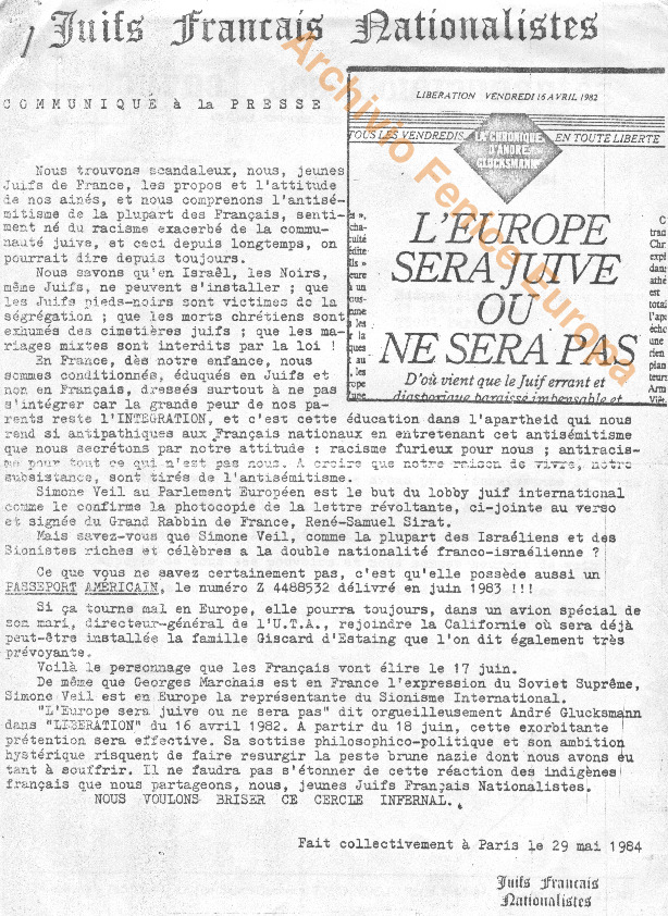 Comunicato stampa degli ebrei nazionalisti francesi del 29/05/84 e nomina della sig.ra Veil. Due pagine.