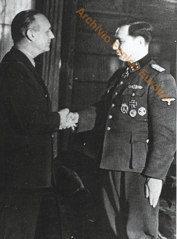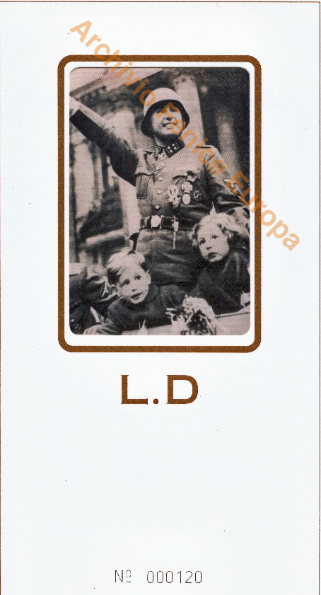 This archive, digitally reproduced here, was personally donated to the managers of this site by the widow of Leon Degrelle and his adopted daughter in Madrid in 2004 so that the same could be kept and disseminated for the sole purpose of promoting knowledge and historical research on figure of Leon Degrelle and on his biographical, political and military path. The archive is published here. Anyone can take advantage of or use it, reproducing the documents in their entirety and without in any case reproducing only partially passages or part of the texts if this in the rest of the text finds its contextualization or the expression by the Author of alternative or critical positions or differently expressed and illustrated. The use is granted only for purposes of culture and historical research and never for apologetic purposes and political and party propaganda. The use, reproduction and dissemination of archive documents must necessarily indicate the source, i.e. Archivio Fenice Europa. The managers reserve the right to protect the Author's rights and their relative rights on the archive from any unlawful conduct, both in civil and criminal matters, in the competent jurisdictional offices. For any information write to raymi@fenice-europa.eu